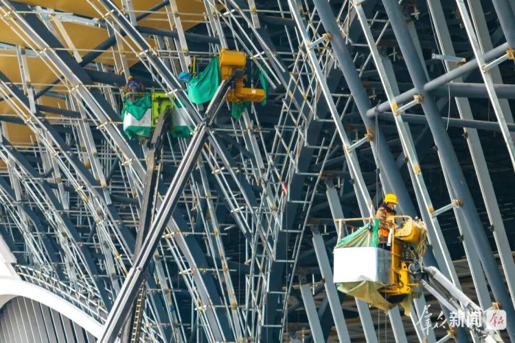 中铁建设作为核心参建单位,主要负责站房主体结构、金属屋面及装饰装修施工任务,其承建的光电玻璃幕墙施工是工程重点难点。西安东站采用的光电玻璃均为异形,且整体设计为超高难度的外倾弧形,安装的龙骨最大倾斜度达75°,最小倾斜度达15°,对安装精度要求极高。为保证每块玻璃精准安装,中铁建设项目团队应用三维建模及北斗高清全站仪,精准定位三维坐标点位超1300个。“我们将每一个龙骨坐标点位误差值控制在毫米级,确保了春节期间104块全异形光电玻璃能够顺利安装。截至目前,已完成16万平方米混凝土结构、15000吨钢结构、7万平方米的金属屋面施工任务,为站房如期具备通车条件筑牢基础。”中铁建设项目总工程师刘健说。